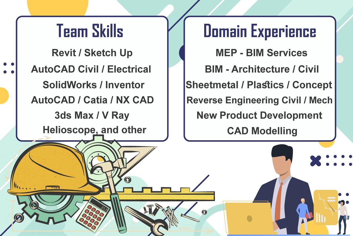 2 D detailing , 3D Modelling, understanding the mechanical requirements and execute efficiently. Our Team is experienced in new Technologies, Software .